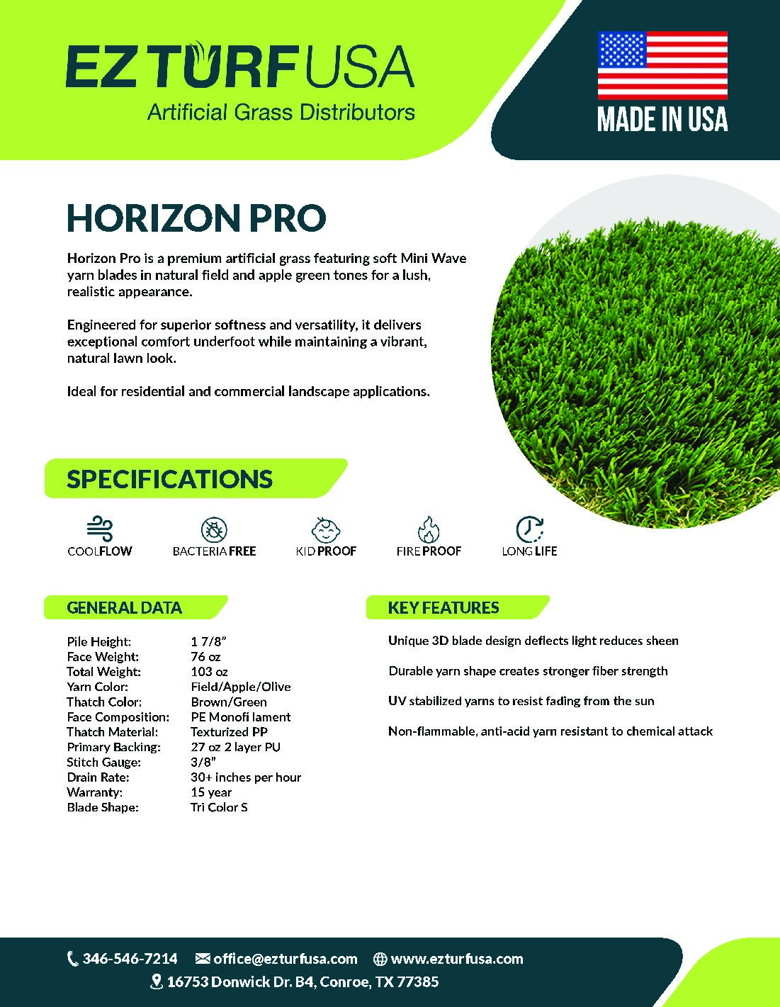 Horizon Pro is a premium artificial grass featuring soft Mini Wave yarn blades in natural field and apple green tones for a lush, realistic appearance.